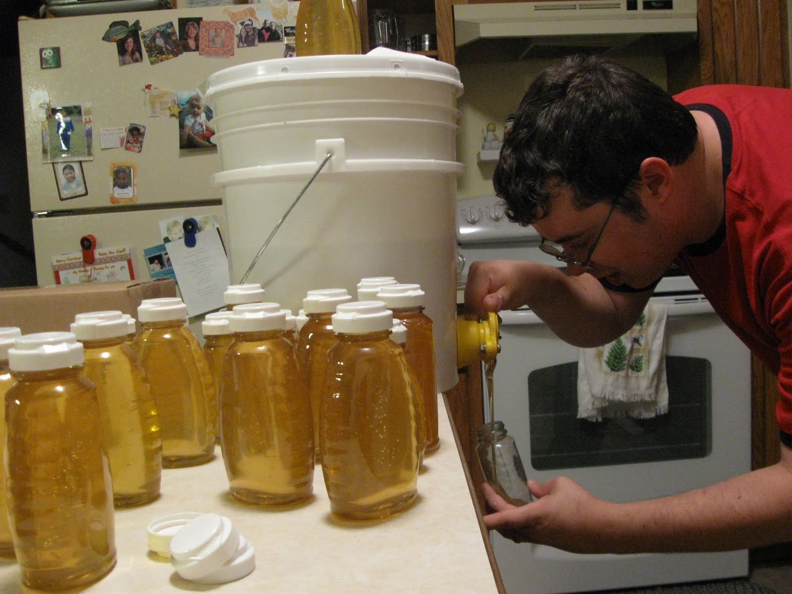 After getting the honey from the hive into a bucket, I needed to bottle the honey for distribution. Honey can be stored in food-grade plastic or stainless-steel air-tight containers for a very long time (centuries in some extreme cases). It shouldn't be stored in containers of other metals because the honey's acidity will oxidize the metal.We purchased a few 5-gallon buckets and a "honey-gate" - a valve that is screwed onto a hole cut into the bottom of the bucket. The honey gate is designed so that it is easy to quickly change the flow from the bucket which allows bottle fillers (me) to avoid overflowing the bottles.